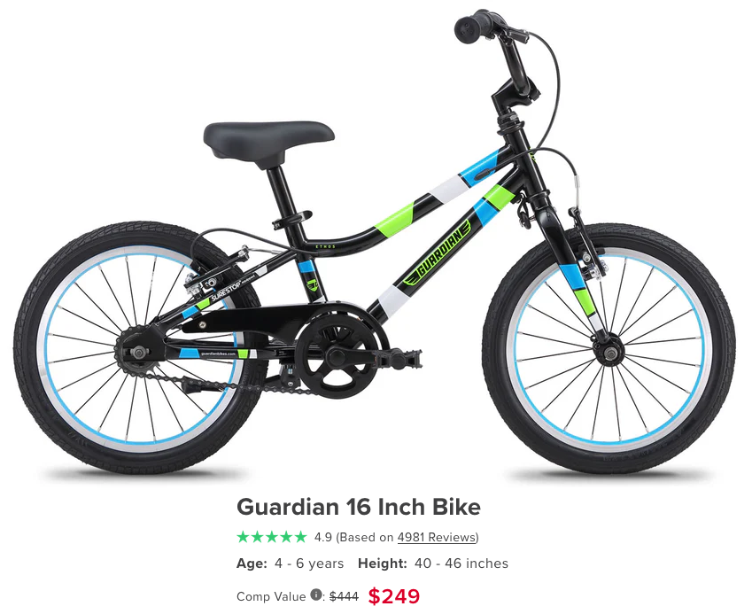 The Guardian 16 Inch Bike has a lightweight steel frame, making it easy to control while still durable enough to outlast your kid. Like every Guardian bike, it’s kid-tested to be safe and fun to ride. $249 plus shipping.